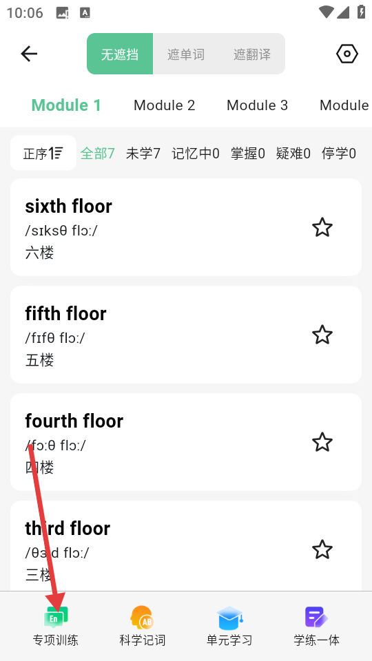 2、在单元学习页面,点击底部【专项训练】,展开专项练习选项。