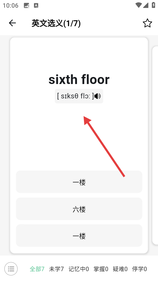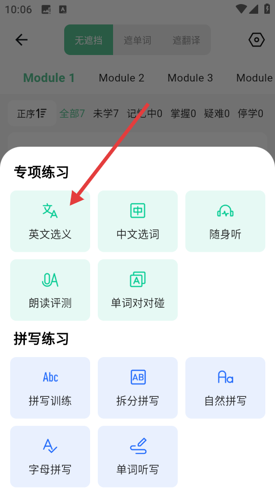 4、在英文选义页面,根据展示的英文单词,选择正确的中文释义来学习。