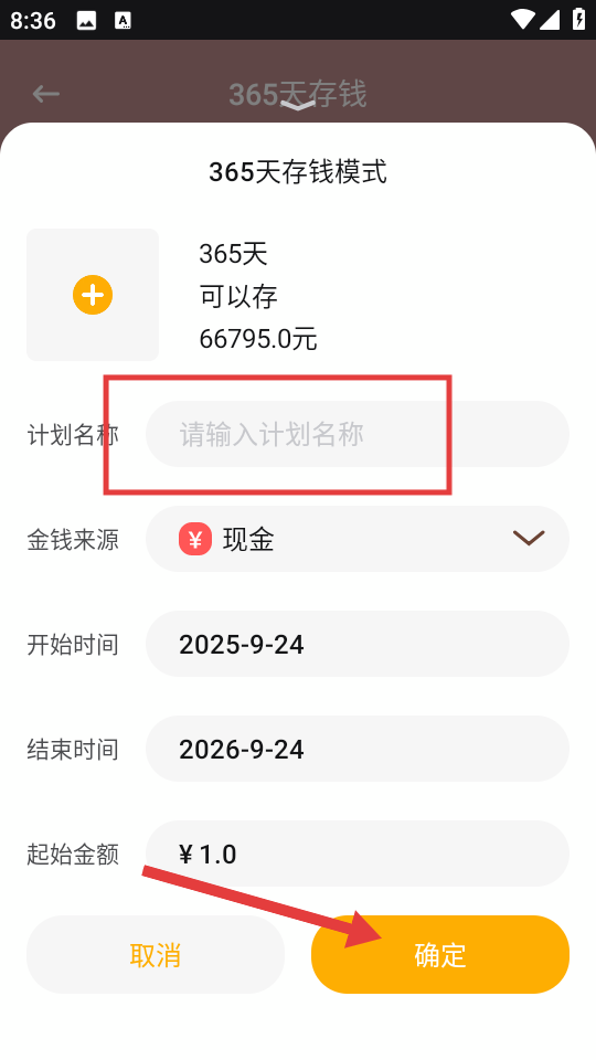 4、在存钱计划设置页面,在【请输入计划名称】输入框中输入计划名称,点击【确定】,完成365天存钱计划的创建。