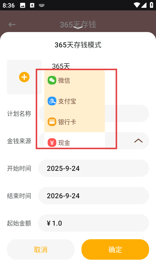 3、在365天存钱模式设置中,点击【金钱来源】,可选择【微信】【支付宝】【银行卡】等金钱来源方式。