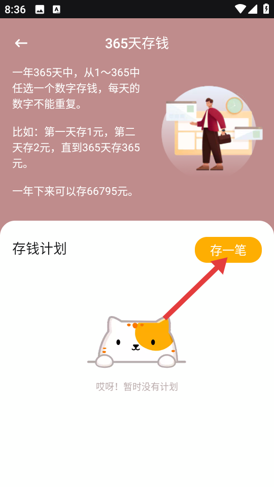 2、进入【365天存钱】页面后,可查看该存钱计划的规则介绍,点击【存一笔】按钮,开始设置具体的存钱计划。