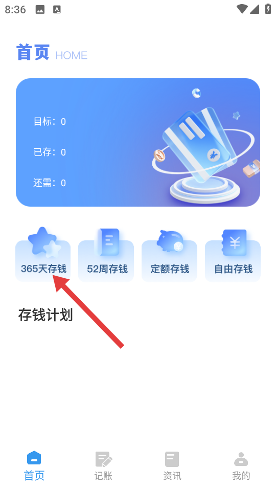 1、在软件首页,可看到多种存钱计划选项,点击【365天存钱】,进入365天存钱计划页面。