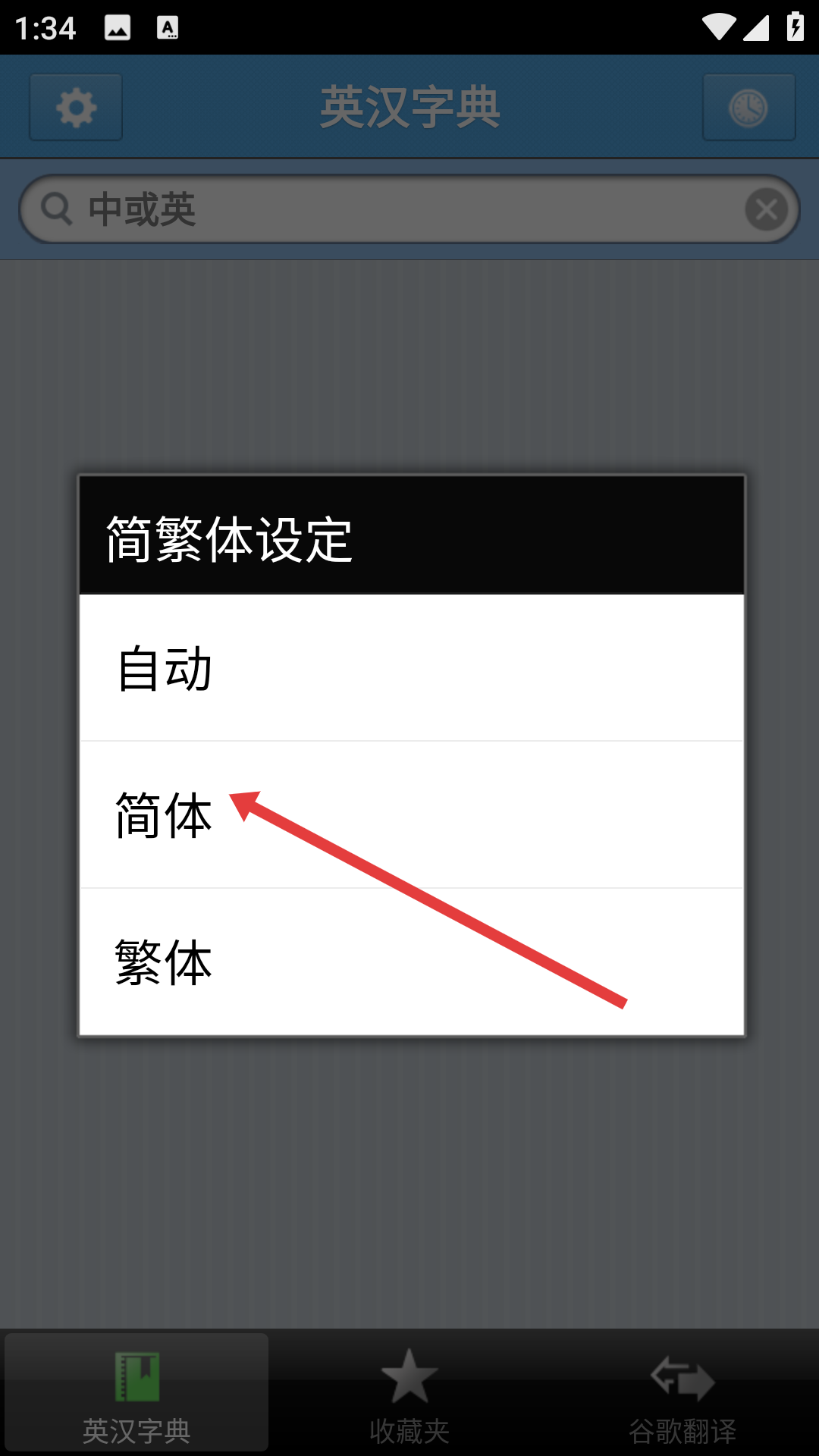 1、打开app,在【简繁体设定】弹窗里,点击【简体】选项,将字典显示设置为简体字。