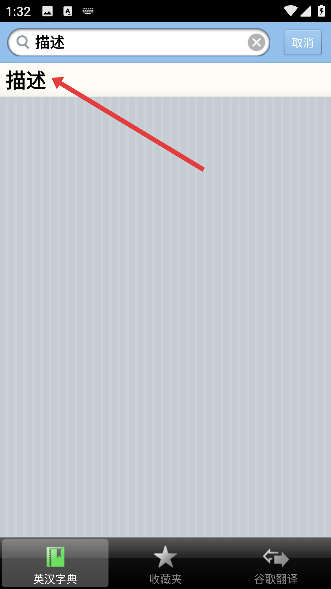 3、在搜索框输入【描述】后,点击显示的【描述】搜索结果,进入详情页面。