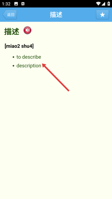4、进入【描述】详情页后,可查看其拼音、英文释义【todescribe】【description】等内容,完成查询。