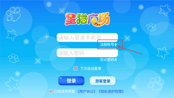 1、在星猫广场登录界面,点击【注册账号】,可进入注册信息填写页面。