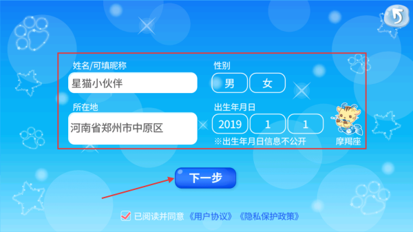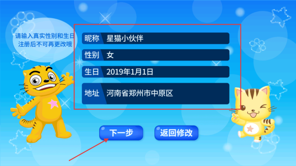 3、进入信息确认页面,核对【昵称】【性别】【生日】【地址】无误后,点击【下一步】。