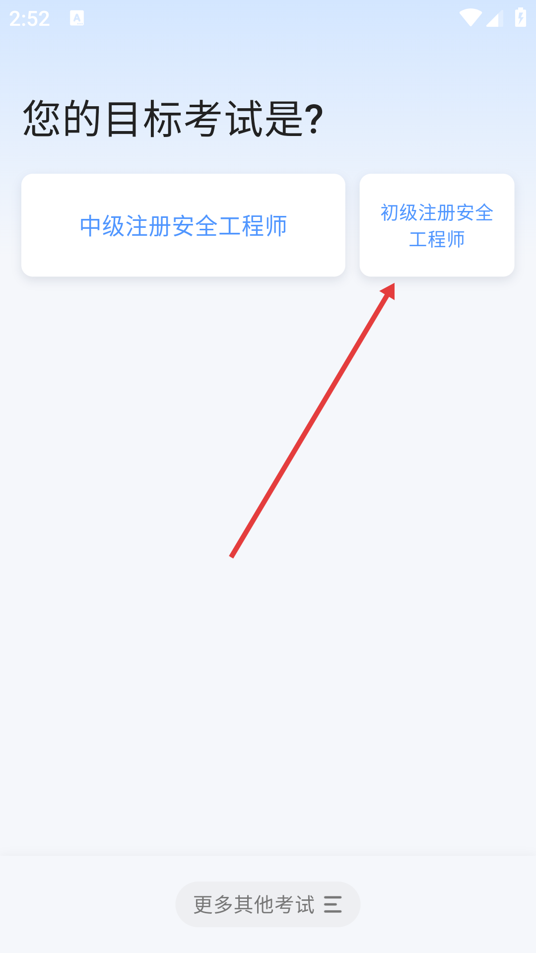 1、在目标考试选择页面,点击【初级注册安全工程师】。