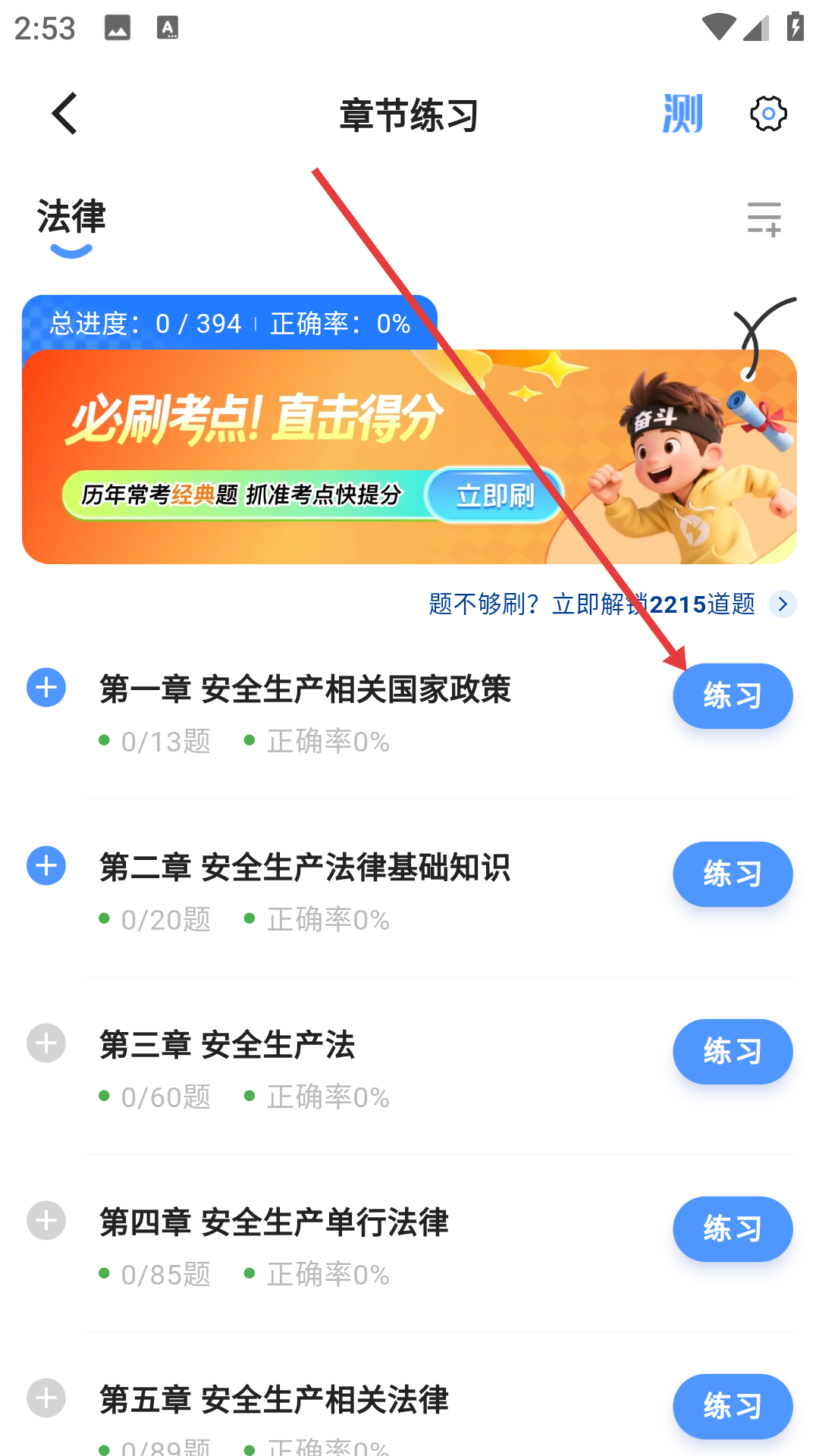 4、在章节练习列表中,找到想练习的章节(如第一章安全生产相关国家政策),点击右侧的【练习】按钮开始做题。