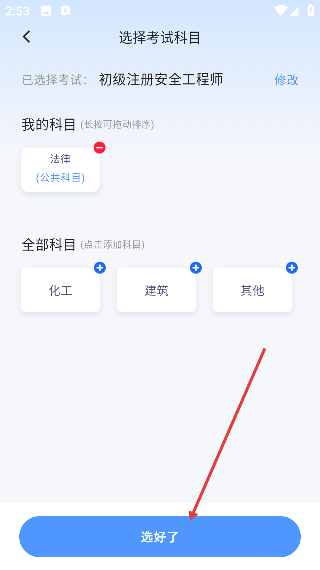 2、在选择考试科目页面,确认或添加所需科目后,点击【选好了】。