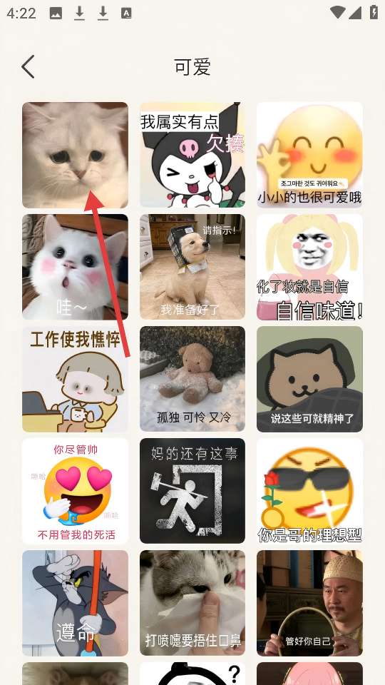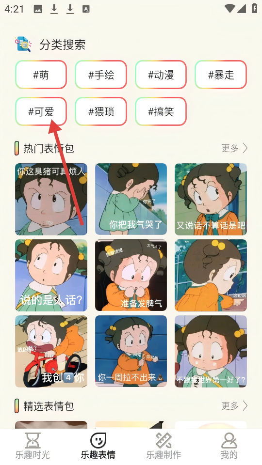 2、在分类搜索区域,点击【#可爱】标签,筛选出可爱类表情包。