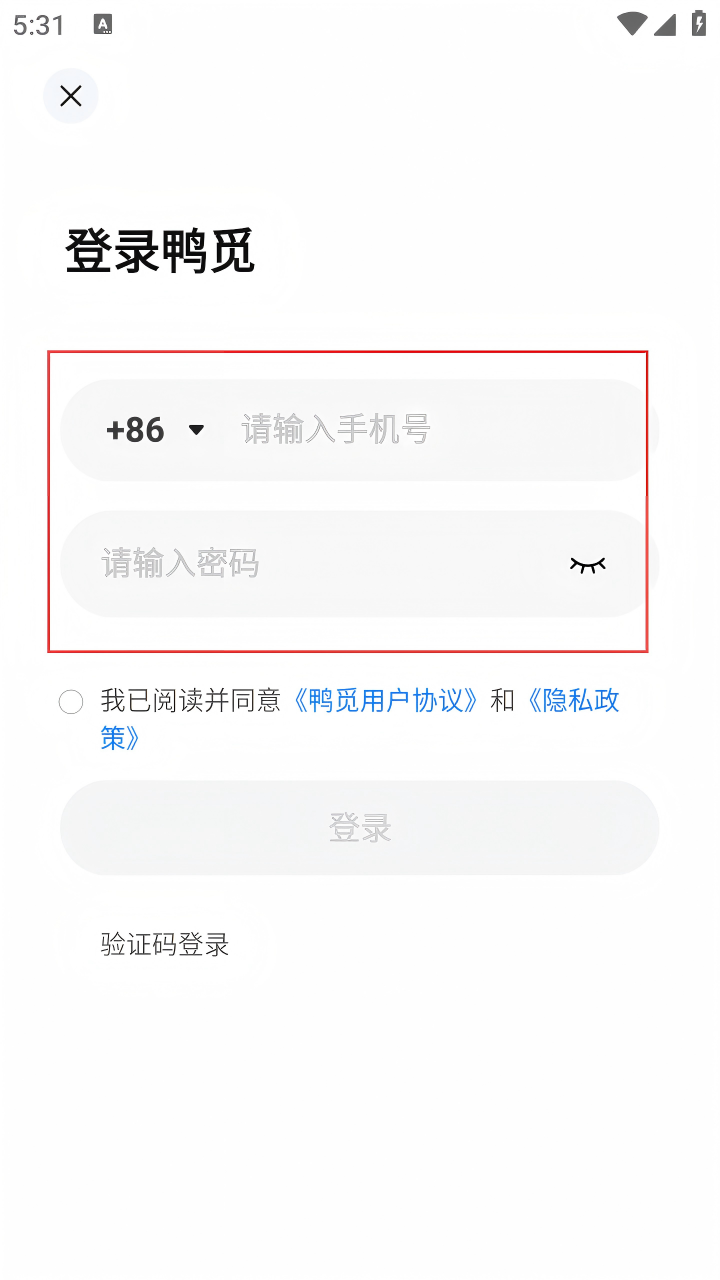 4、在密码登录界面,依次输入手机号和密码,勾选“我已阅读并同意《鸭觅用户协议》和《隐私政策》”后,点击【登录】按钮,即可完成密码登录操作。