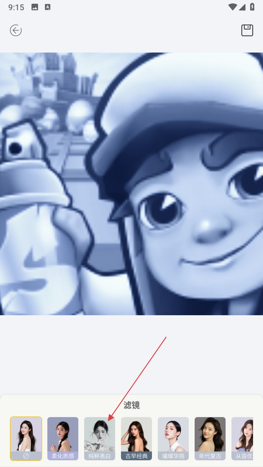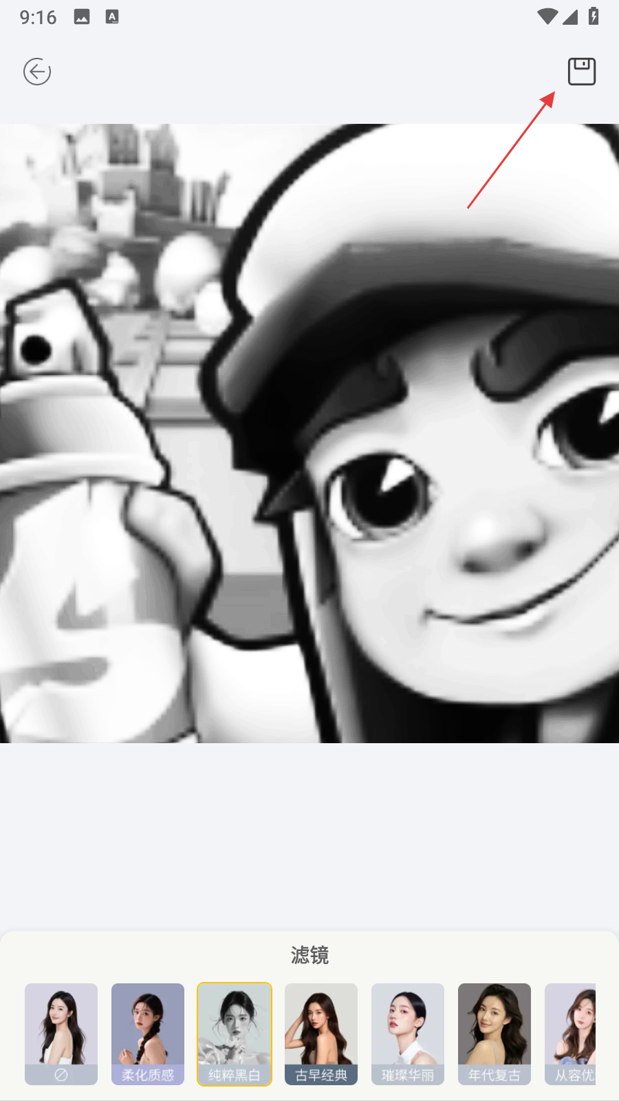 4、图片滤镜效果调整好后,点击【右上角的保存图标】,即可保存编辑后的图片。