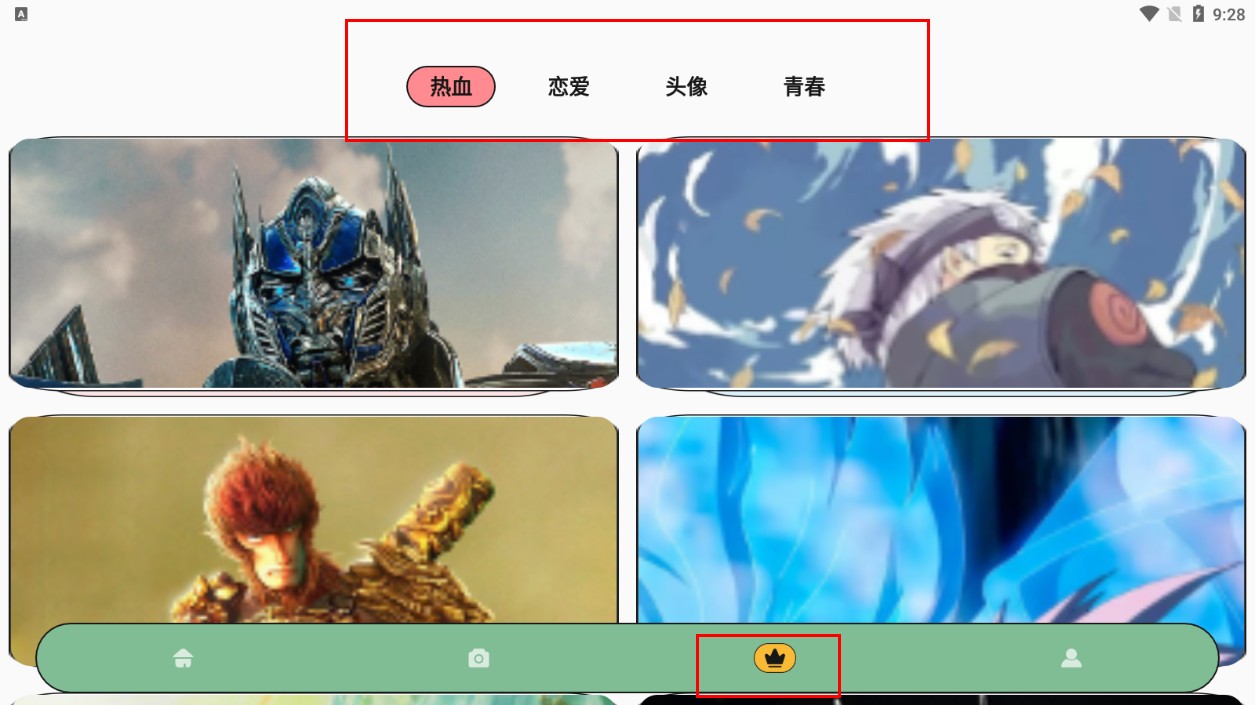 4、点击底部皇冠图标,可在热血、恋爱、头像、青春等分类下载壁纸相关内容。