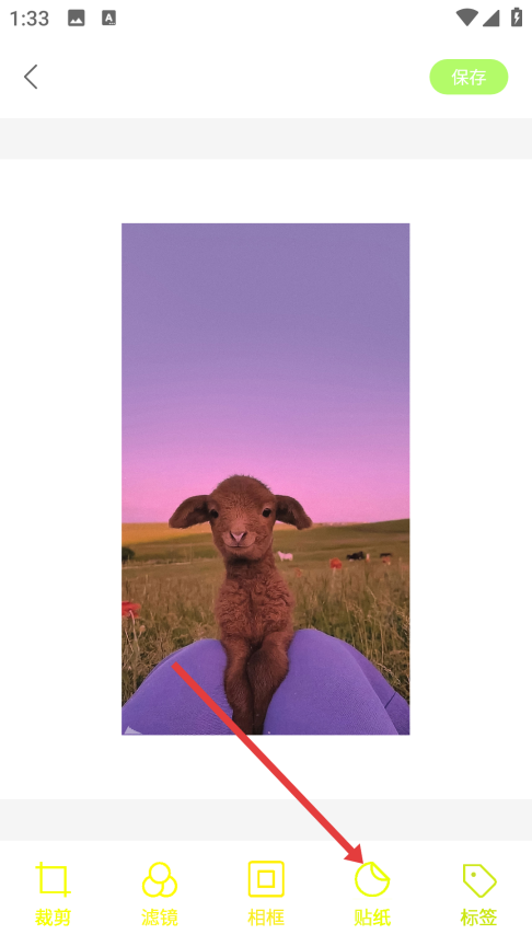 3、在图片编辑界面中,可以对图片进行裁剪、添加滤镜、添加相框等操作,点击底部的【贴纸】选项,展开贴纸选择栏。
