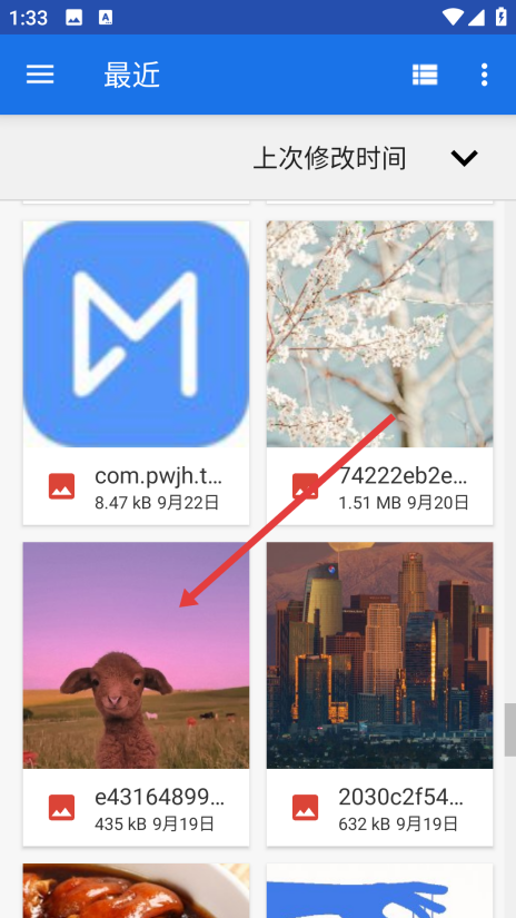 2、在“最近”分类的图片列表里,点击选中要编辑的小羊图片,进入图片编辑界面。