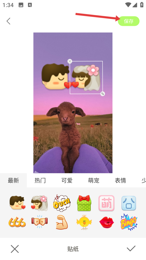4、从贴纸选择栏中选喜欢的贴纸添加到图片上,调整到合适的角度后点击右上角【保存】,完成图片编辑。