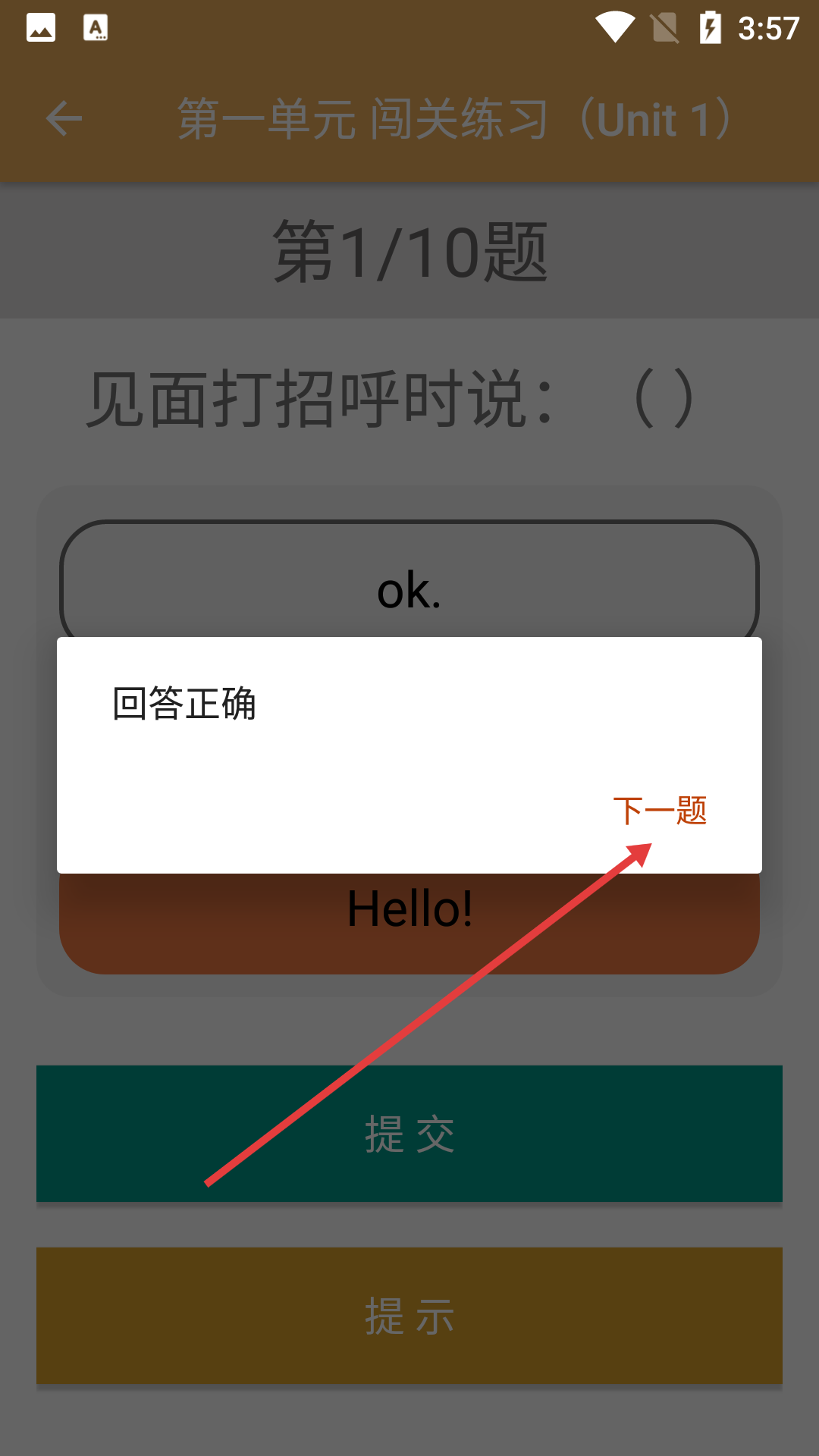3、答题时选正确选项(如见面打招呼选【Hello!】),点击【提交】。