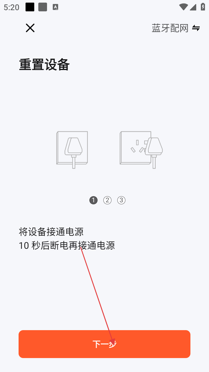 4、若要重置设备,先按提示将设备接通电源,10秒后断电再接通,然后点击橙色【下一步】按钮,继续后续重置操作。