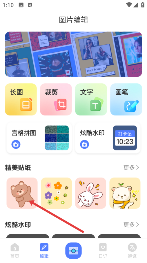 2、在图片编辑页面,找到【精美贴纸】区域,挑选并点击喜欢的贴纸,准备添加到图片上。