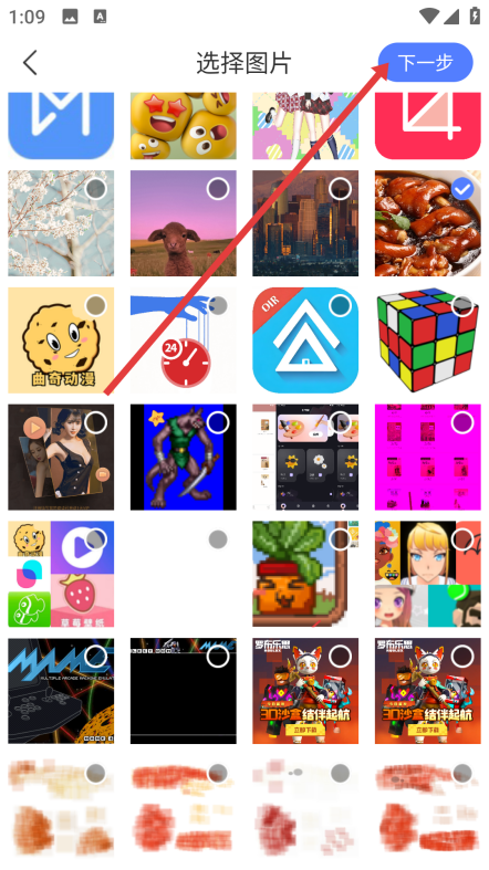3、进入选择图片界面,选中需要添加贴纸的图片后,点击右上角的【下一步】按钮,进入贴纸编辑环节。