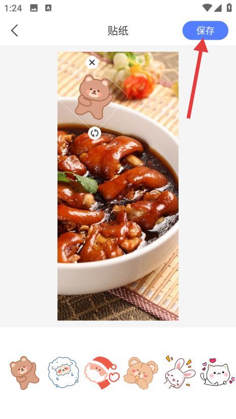 4、在贴纸编辑页面,将选中的贴纸添加到图片合适位置,调整好后点击右上角的【保存】按钮,完成带贴纸的图片编辑。