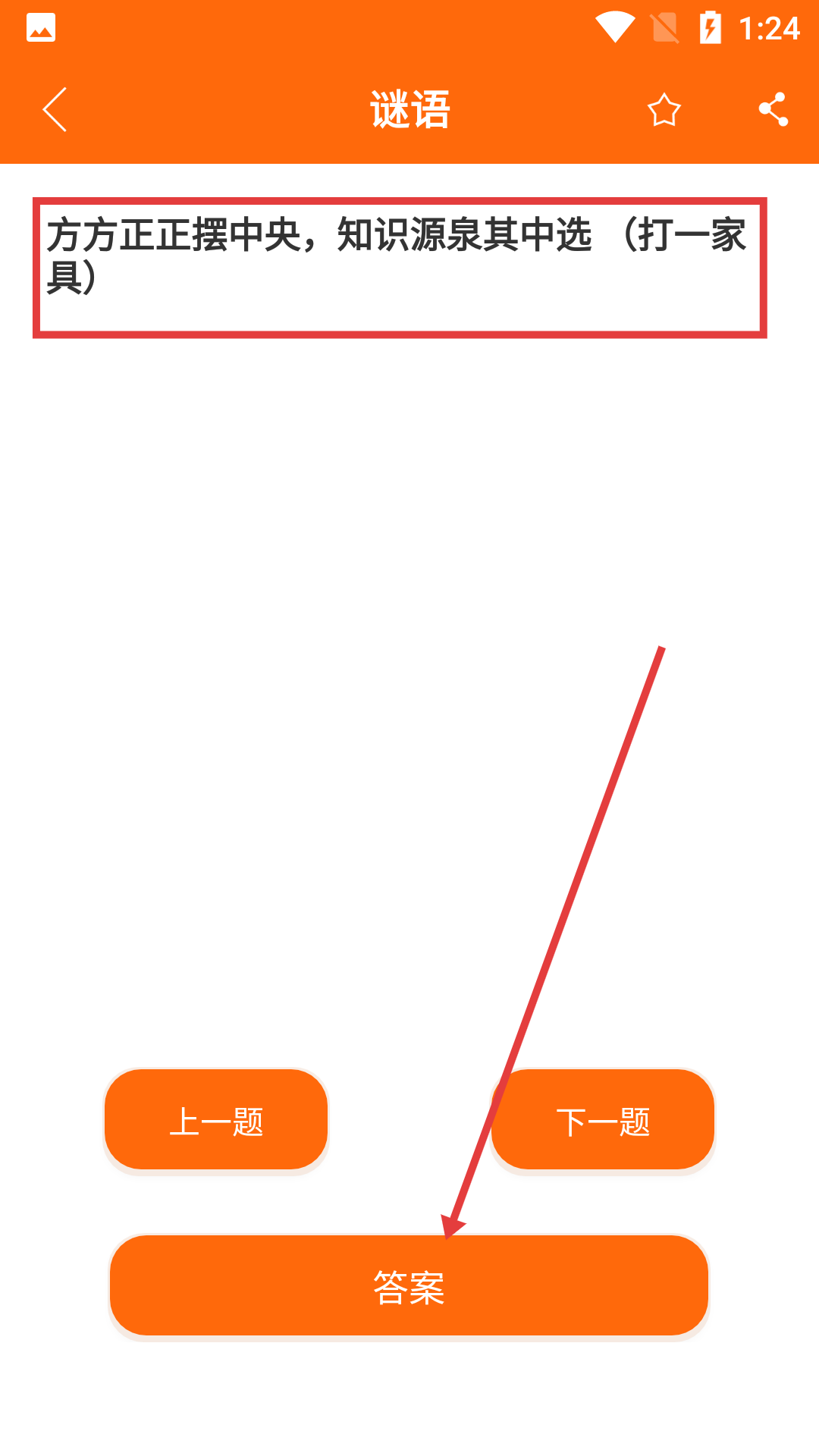 3、看到谜语“方方正正摆中央,知识源泉其中选(打一家具)”后,点击底部【答案】按钮。