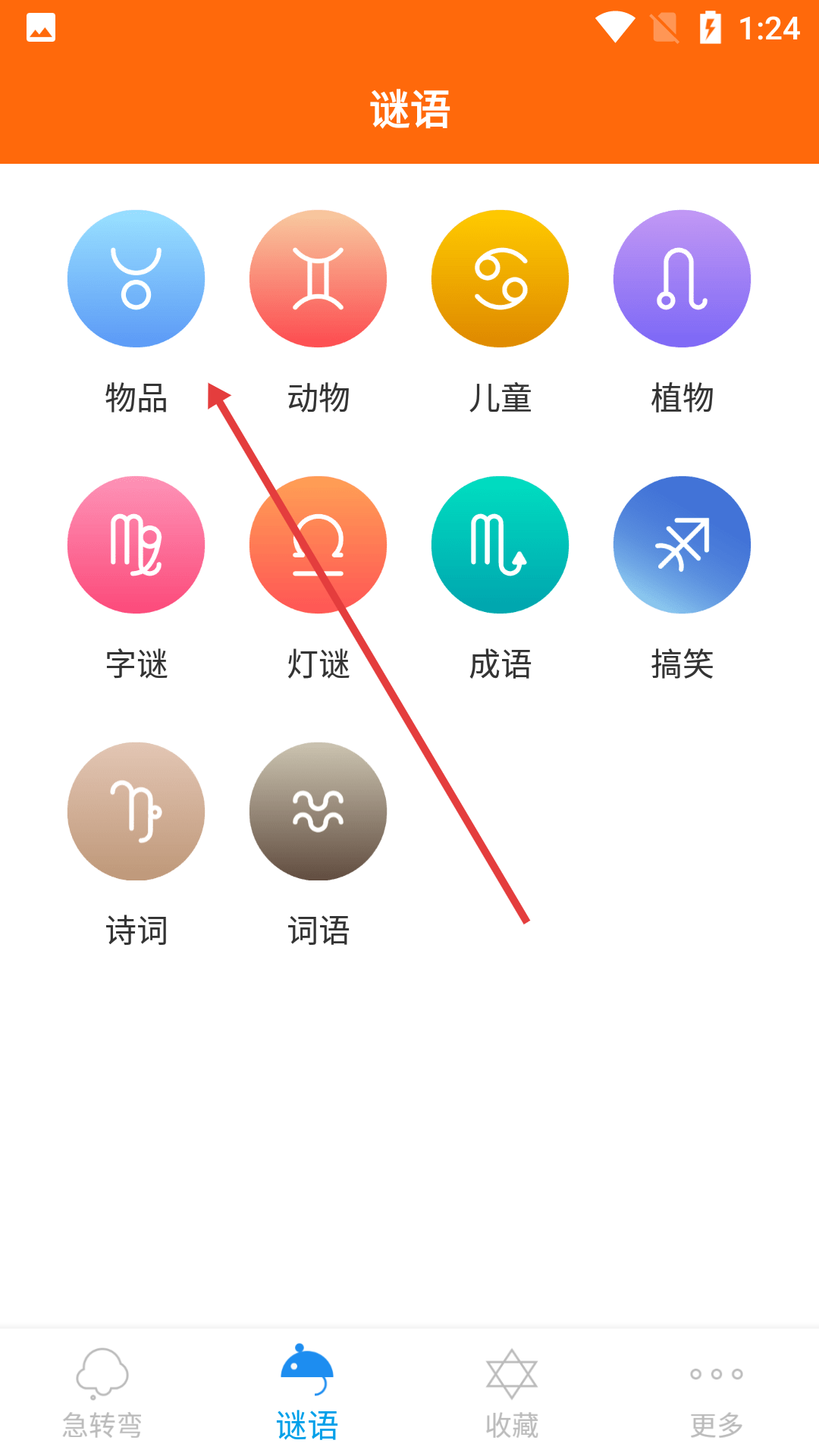 2、在谜语分类页面,点击【物品】分类图标,进入物品类谜语页面。
