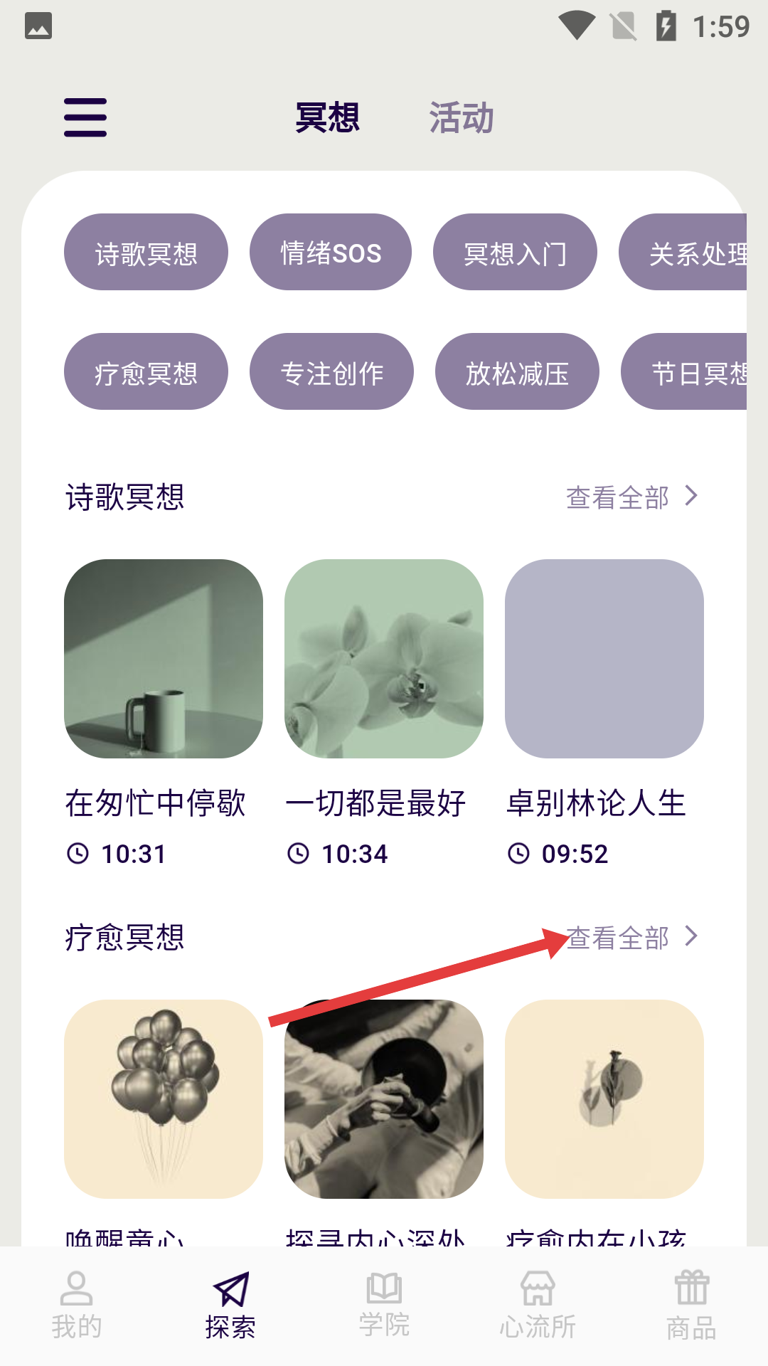 2、在探索页面的“冥想”分类下,找到【疗愈冥想】区域,点击“查看全部”,进入疗愈冥想列表页面。