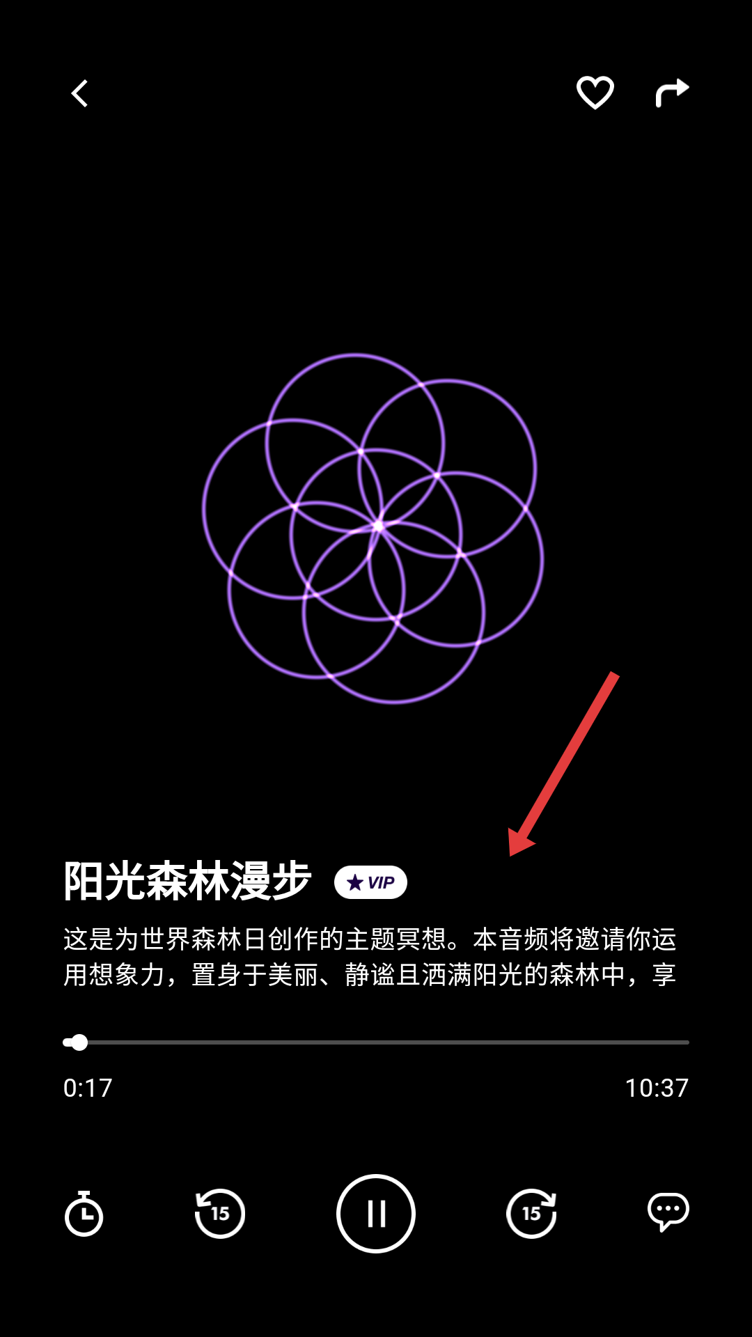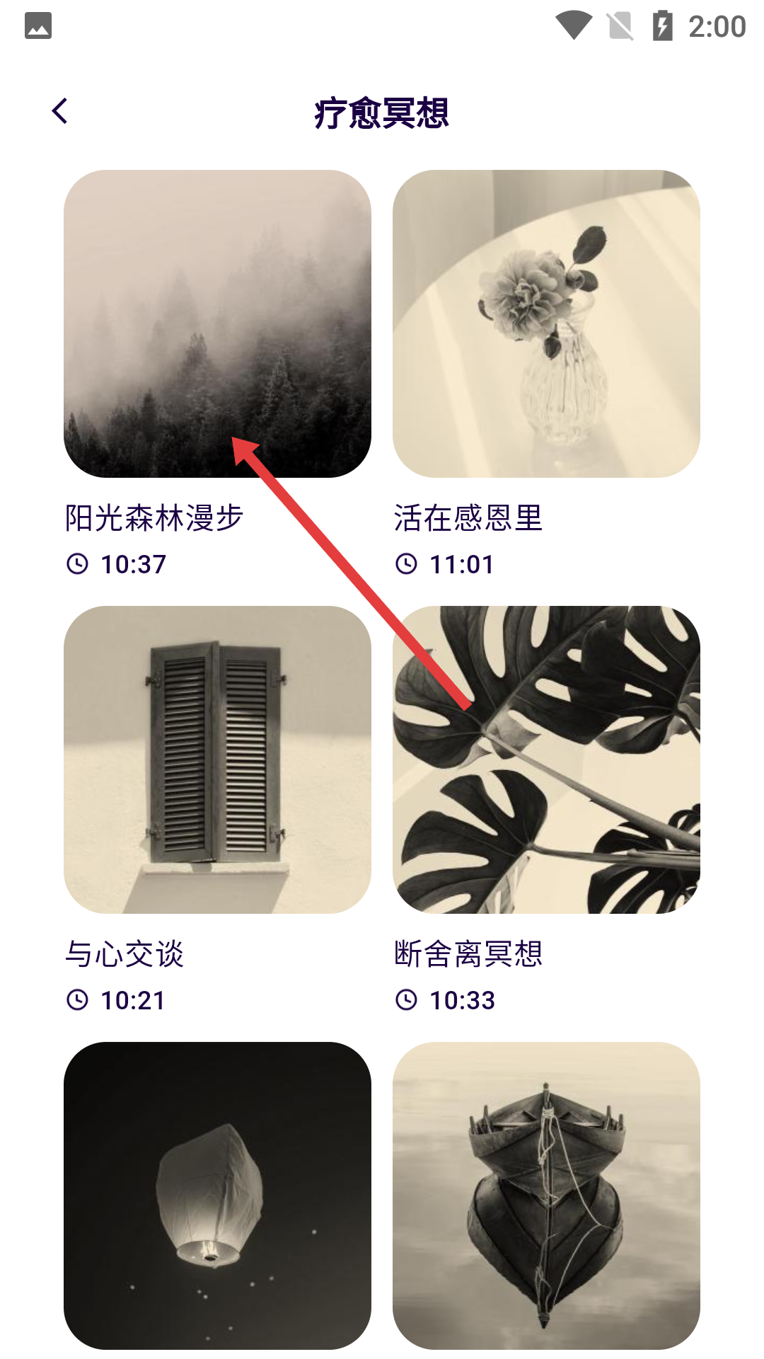 3、在疗愈冥想列表中,选择【阳光森林漫步】冥想内容,进入该冥想的播放页面。
