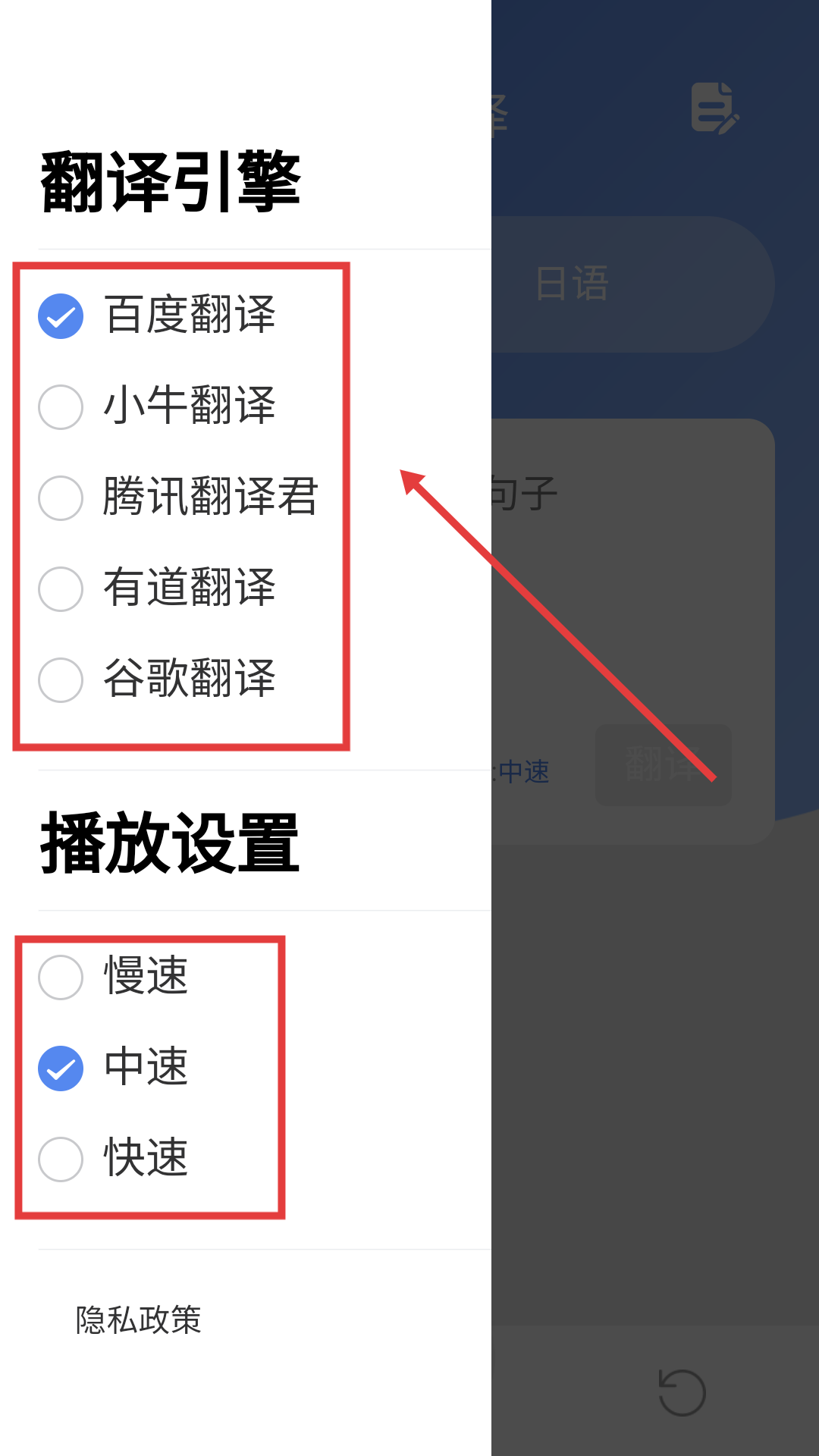 1、在设置页面选择翻译引擎(如【百度翻译】)和播放速度(如【中速】)。