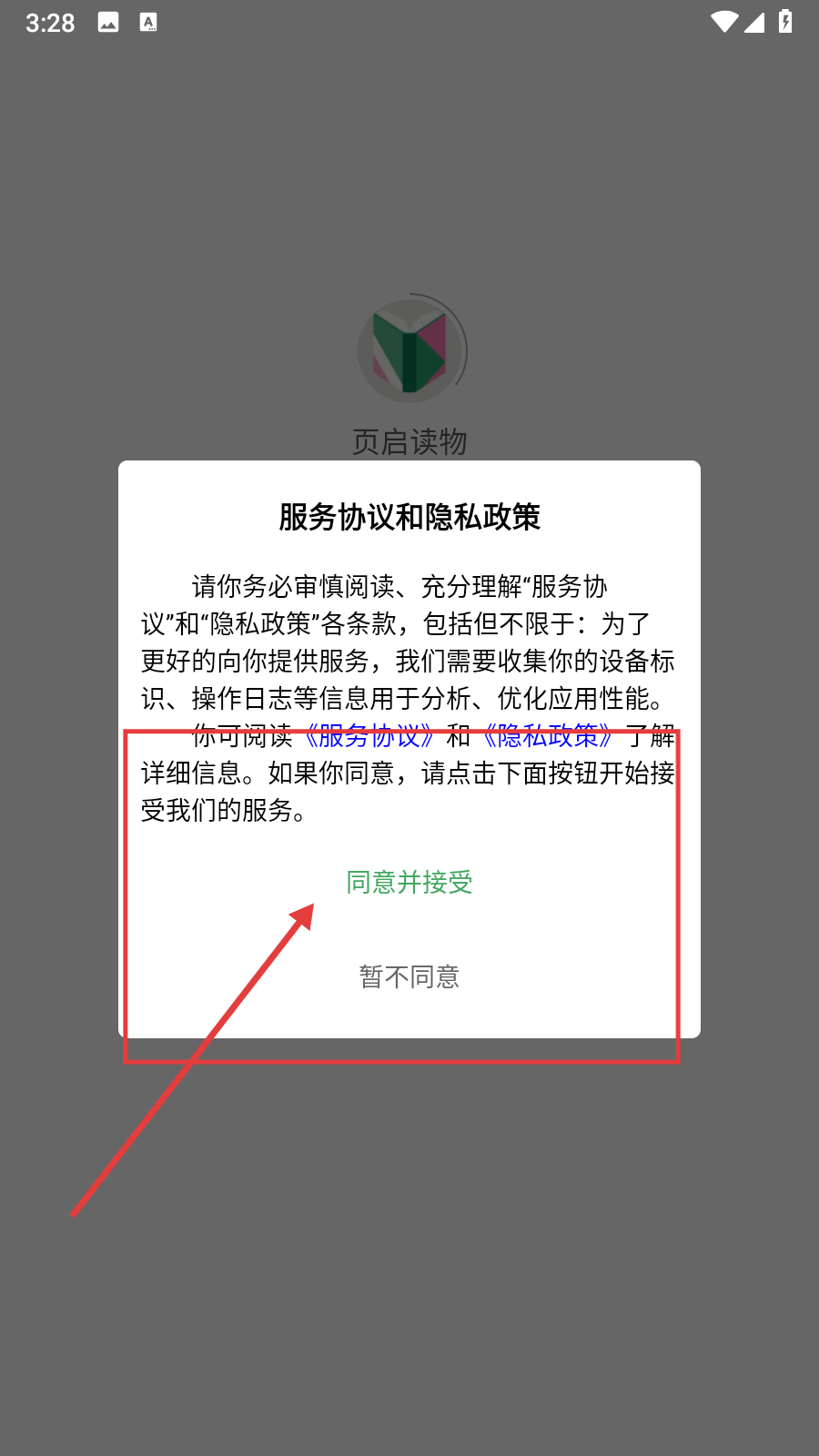 1、打开软件,会弹出【服务协议和隐私政策】弹窗,阅读后点击【同意并接受】即可进入。