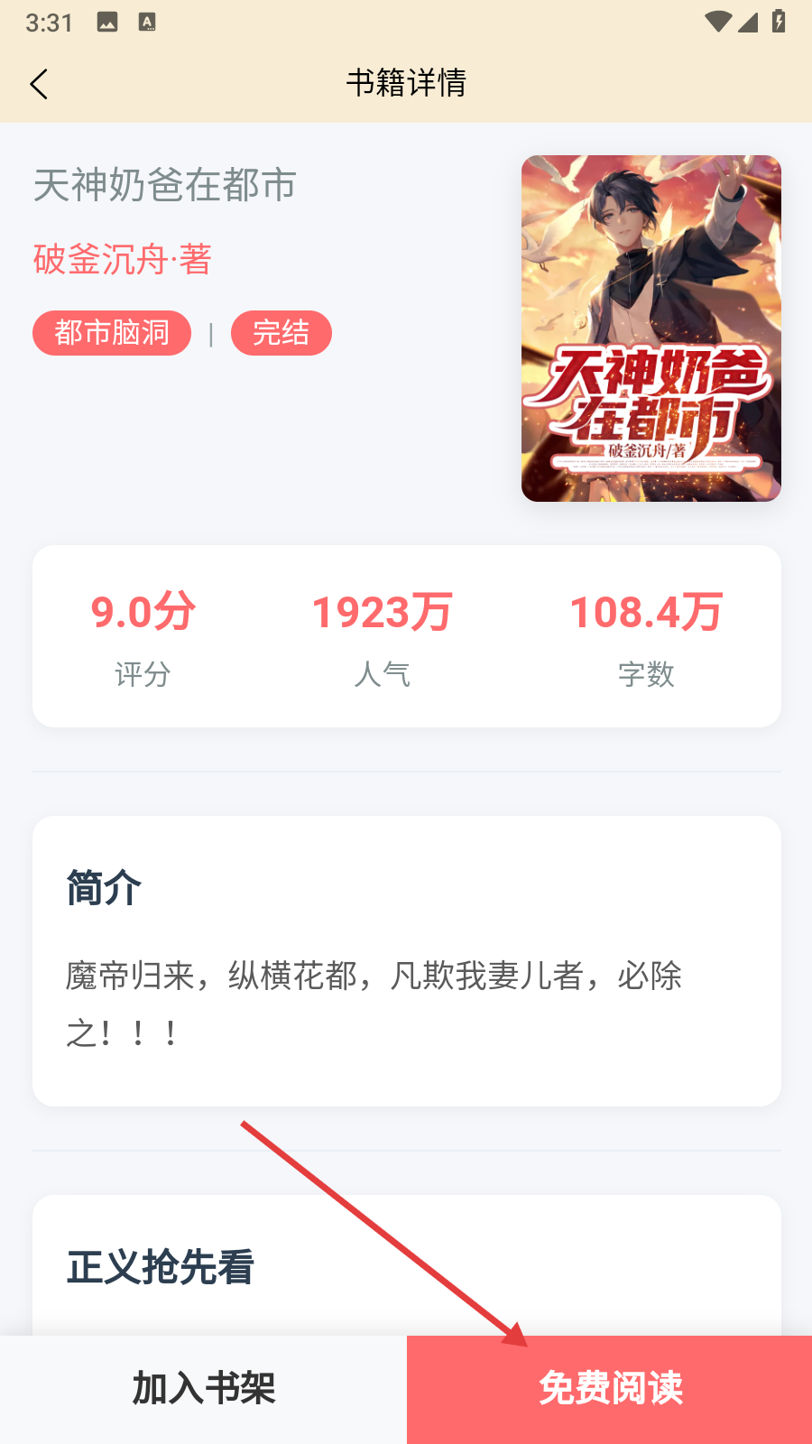3、进入书籍详情页,可查看评分、人气等信息,点击【免费阅读】即可开始阅读。