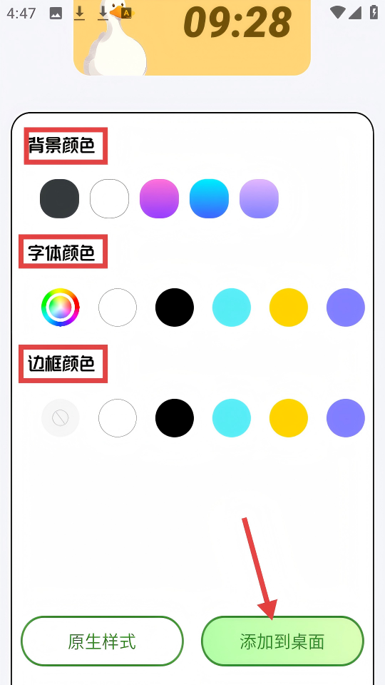3、对选中的小组件,设置【背景颜色】【字体颜色】【边框颜色】后,点击【添加到桌面】按钮。