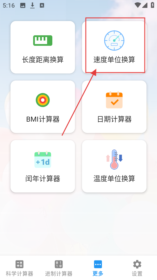 2、在更多工具页面,找到【速度单位换算】选项并点击,就能进入速度单位换算界面啦。