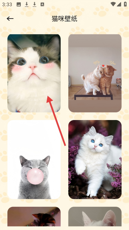 3、在猫咪壁纸页面,点击喜欢的猫咪壁纸(如左上角带腮红的猫咪壁纸),可进入该壁纸的详情页面。