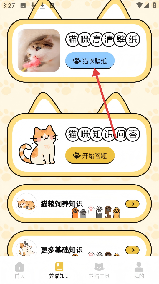 2、在养猫知识页面,点击【猫咪壁纸】按钮,可进入猫咪壁纸的选择页面。