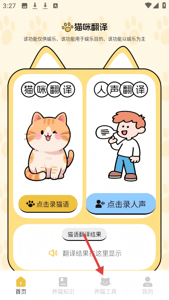 1、在猫咪翻译页面,点击底部【养猫知识】选项,可进入养猫知识页面。