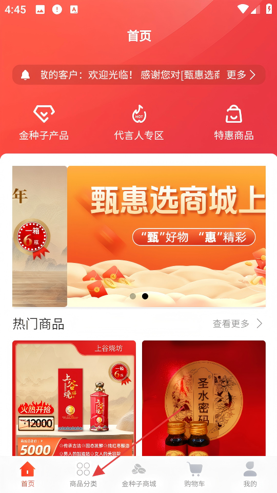 1、点击页面底部【商品分类】,进入商品分类页面。