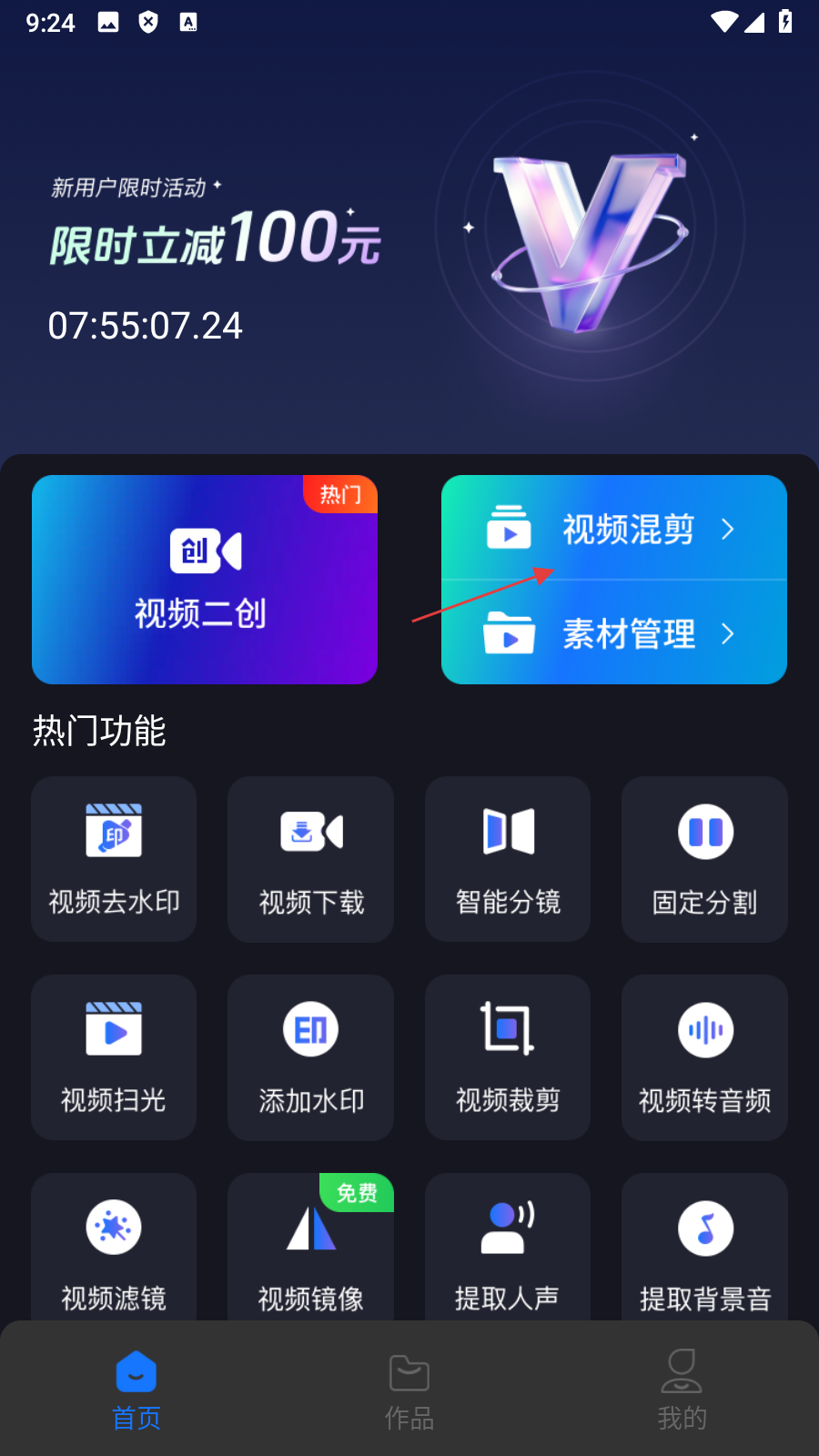 1、在首页,点击【视频混剪】,进入素材库页面。