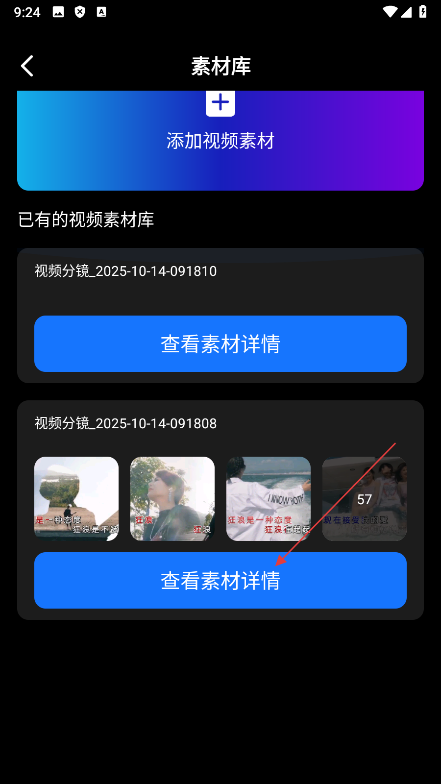 2、在素材库页面,点击【查看素材详情】,进入视频分镜页面。