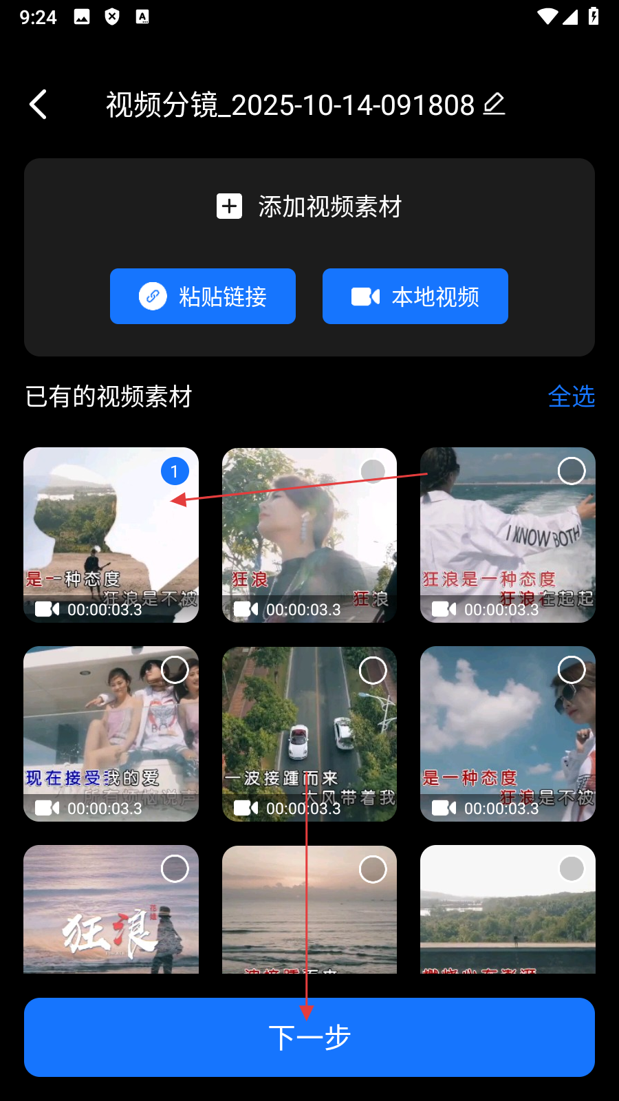 3、在视频分镜页面,【选择已有视频素材】后点击【下一步】,进入视频混剪页面。