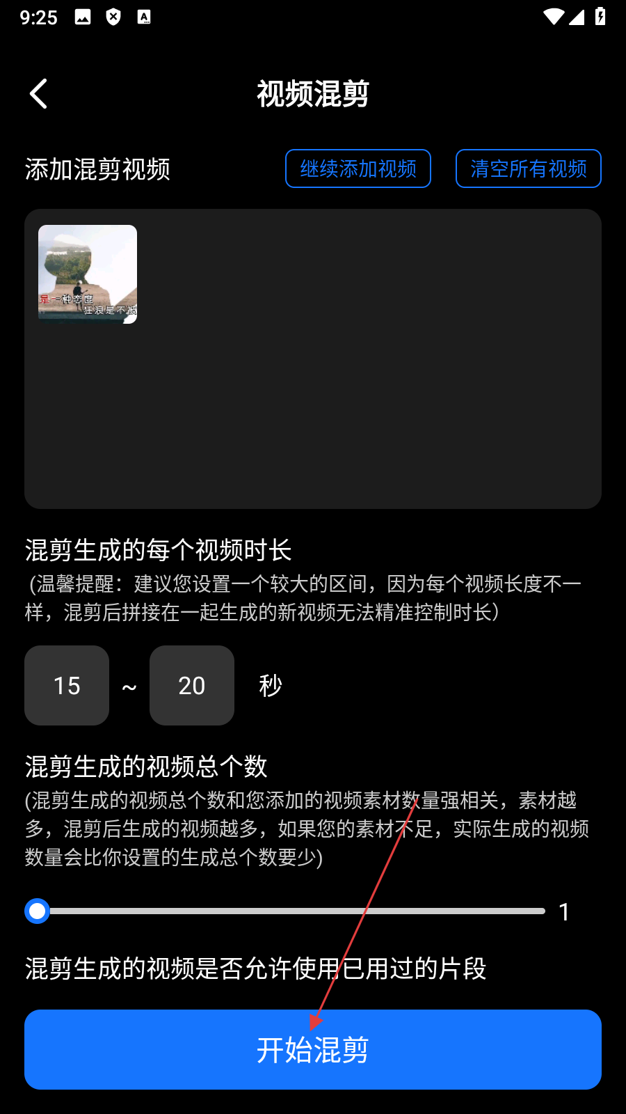4、在视频混剪页面,设置好参数后点击【开始混剪】,即可进行视频混剪操作。
