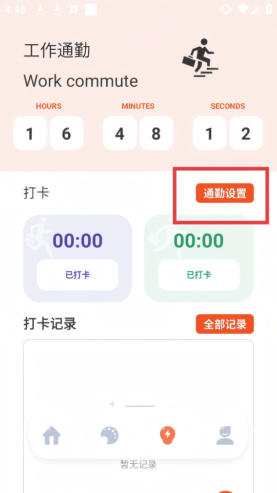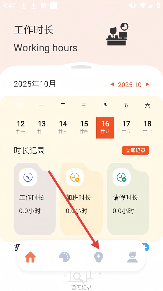 1、打开工作时长记录类APP,点击底部闪电形状的图标,进入工作通勤页面。