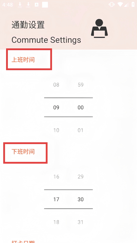 3、在通勤设置界面,设置【上班时间】和【下班时间】,选择合适的时间点。