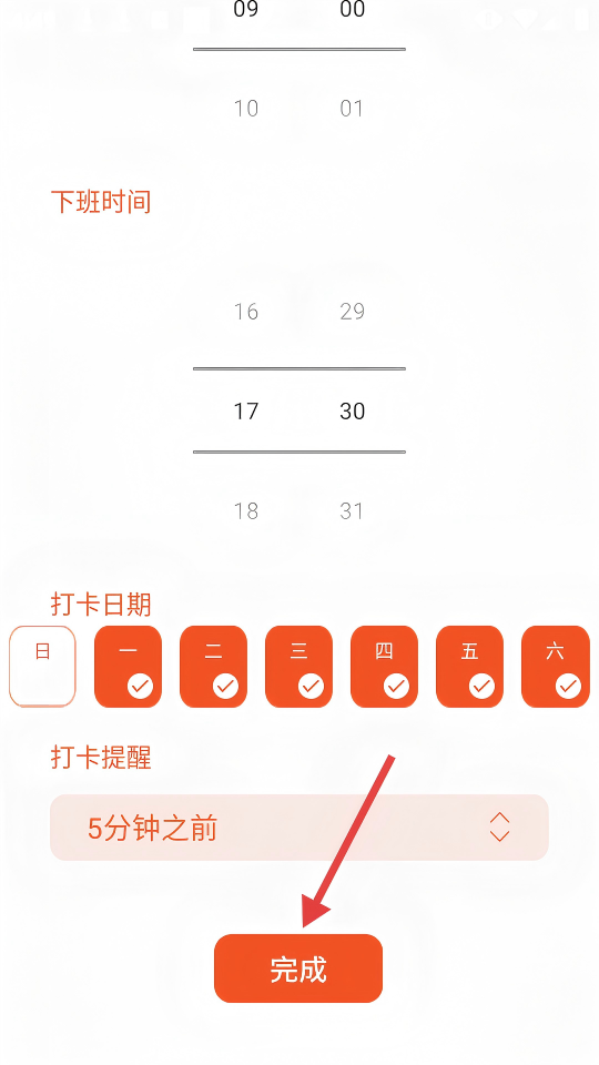 4、接着设置打卡日期、打卡提醒时间,设置好后点击【完成】,即可保存通勤设置。