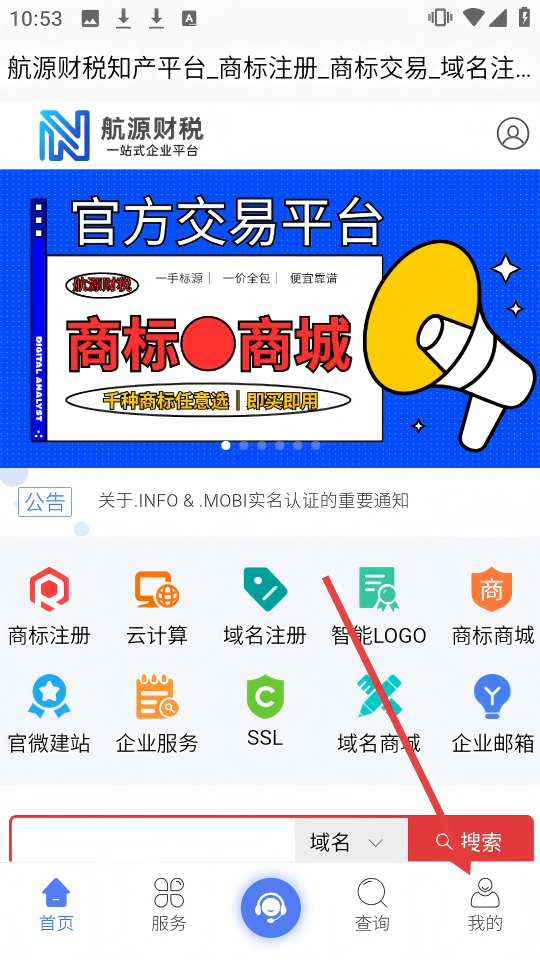 1、打开航源财税平台首页,点击底部【我的】,进入用户登录页面。
