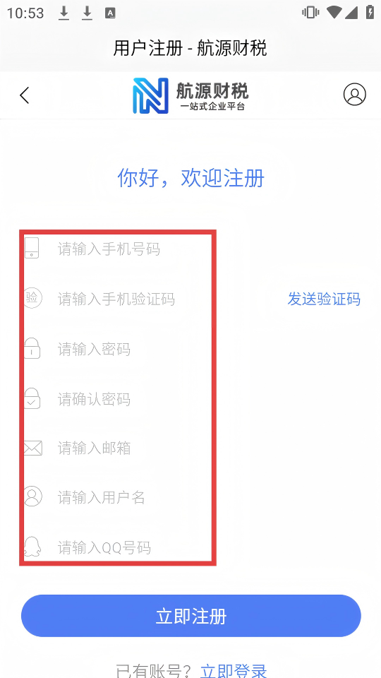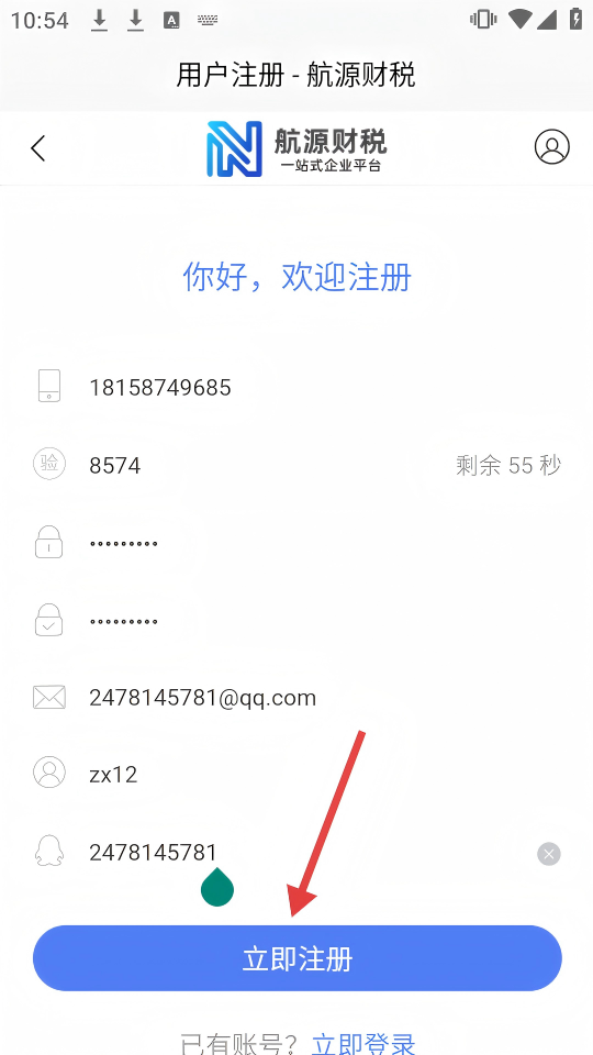 4、信息填写完毕后,点击【立即注册】,即可完成航源财税平台的账号注册。
