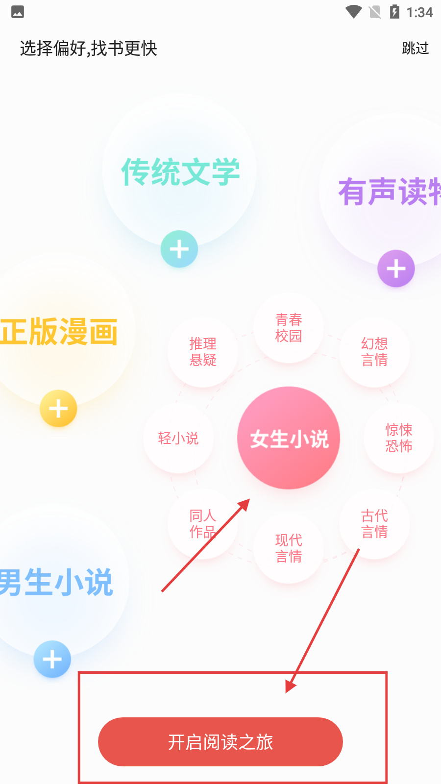 1、进入软件后,可选择书籍偏好,之后点击【开启阅读之旅】,进入书籍相关页面。