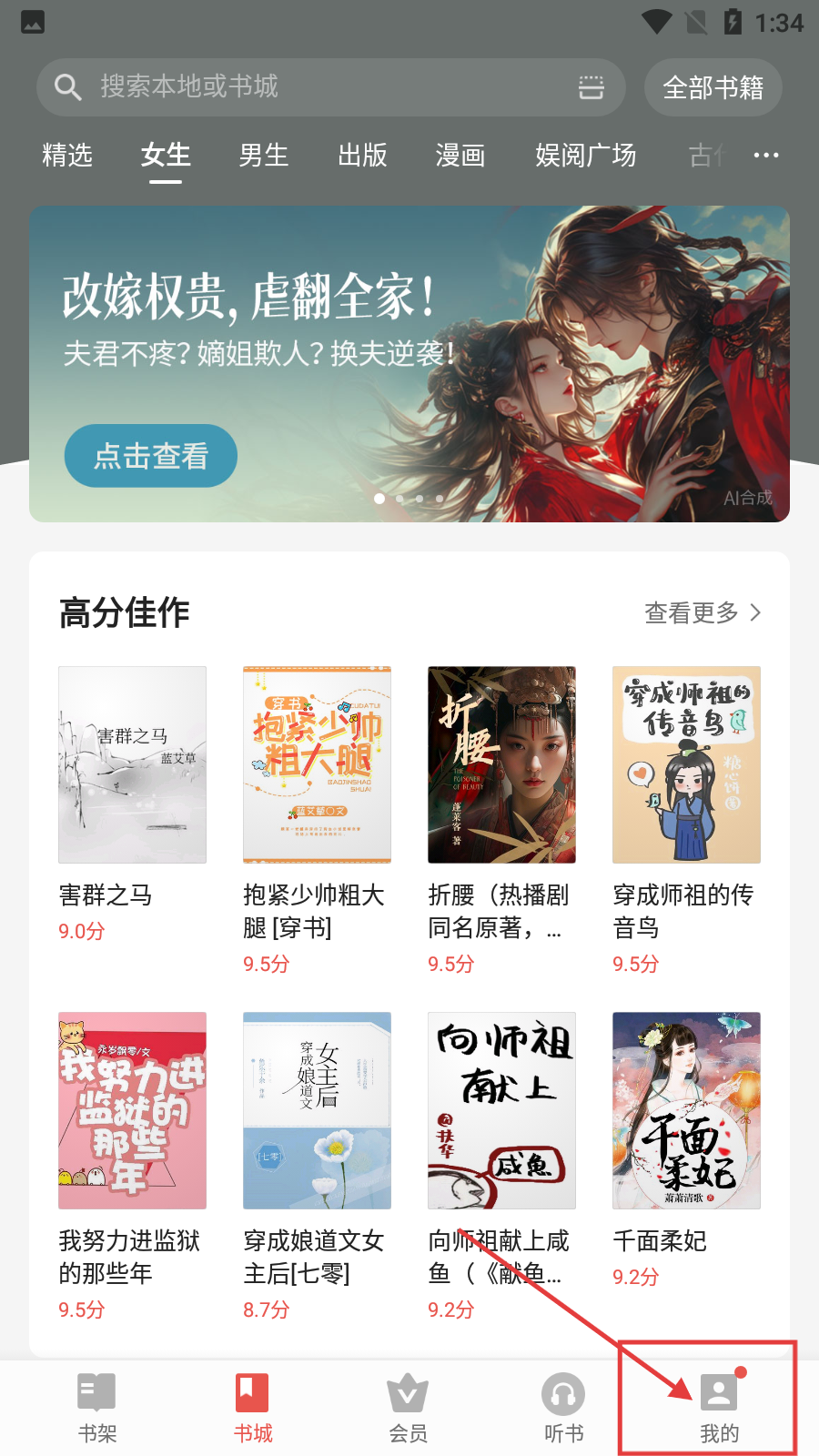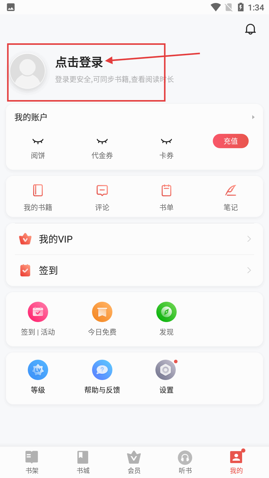 2、在书城页面,点击底部【我的】按钮,可进入个人页面,查看账号等功能。